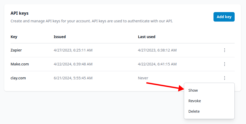 - Go to the API Keys page and click “Add Key” to create a new API key. Name the key something like “Clay.com Integration”.